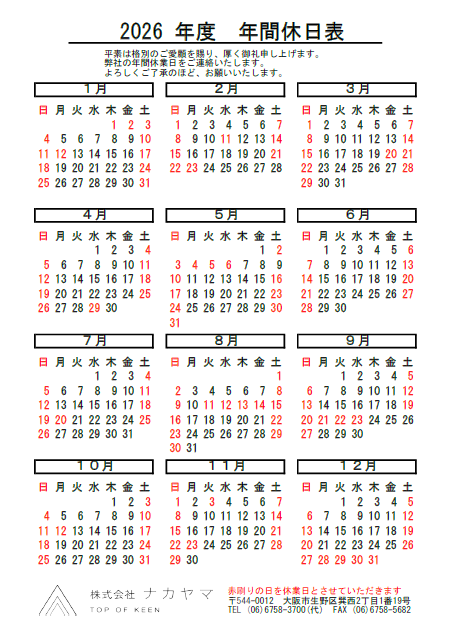 平素は格別のお引き立てを頂き、厚く御礼申し上げます。年間休日【2026年】のお知らせで御座います。
